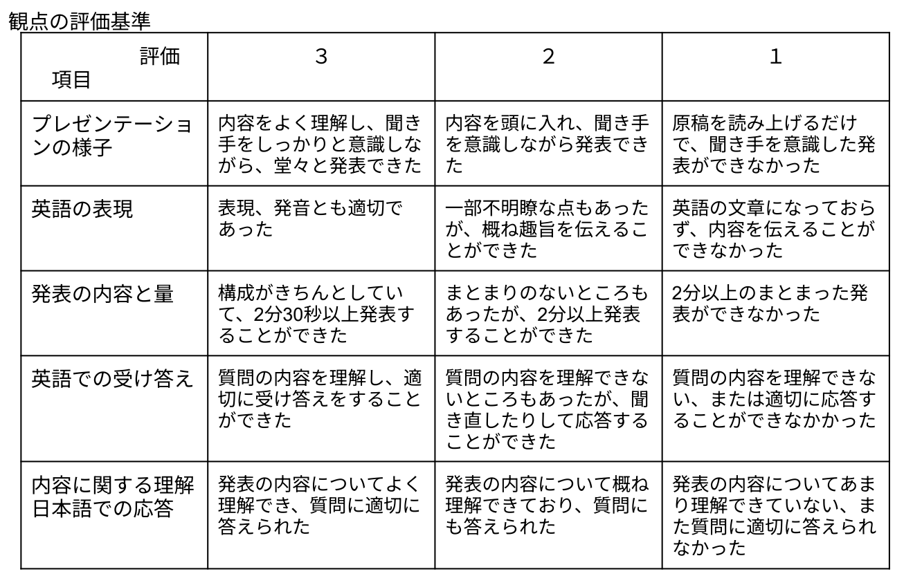 ・テーマについて英語で、3分程度のプレゼンテーションを行います。