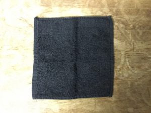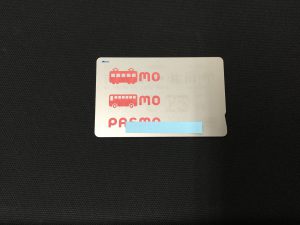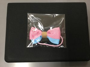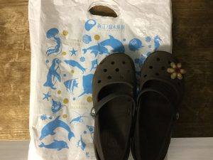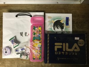バザーの購入品(文房具)、華道部製ピンクの髪留め、PASMO、ブレスレット、黒ハンドタオル、こげ茶のクロックス