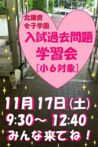 みにゃさま、ごきげんよう!北鎌倉女子学園のアイドルキャット「しぶろく先生」と「ごぶごぶ先生」です。11月12月は、みにゃさまとお会いできるチャンスがたくさんあるので、楽しみにしております。今週の土曜日には過去問題をお勉強する会もございます。ぜひ一緒にお勉強しましょう!