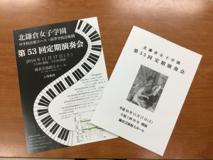 ごきげんよう。2年音楽科です。私達音楽科は11月17日(土)に鎌倉芸術館で「第53回 定期演奏会」を行います。今回は個人演奏の他に中学合唱、木管打楽器合奏、金管楽器合奏、弦楽合奏、高校合唱、そして卒業生によるヴァイオリン独奏があります。高校合唱の曲は各パートが独立して動くところが多く、全体で合わせるのがとても難しいです。授業だけでなく、朝や昼休みを使って、毎日、一生懸命練習しています。また毎年、この定期演奏会は高校2年生が裏方の責任者となり、演奏会がスムーズに進むように仕事をしています。昨年は先輩方と一緒に舞台係や受付、ドア係などを行い、演奏会を支える裏方の仕事の大切さを知りました。今年は私達が中心となり、その役割を果たします。舞台に関わる方々すべてに感謝し、定期演奏会を成功させたいと思っています。是非、中学校音楽コース、高校音楽科の演奏を聴きに、そして私達の作り上げる演奏会を楽しみにいらしてください。お待ちしています。(M.N,M.Y)