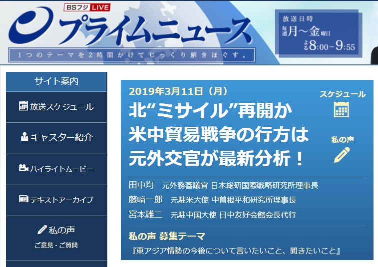 3月11日(月)20:00~21:55、BSフジのプライムニュースに本校理事長の藤崎一郎先生がゲスト出演します。外務省同期入省の3人で、『北“ミサイル”再開か 米中貿易戦争の行方は』と題して、日本を取り巻く東アジア情勢ついて語る模様です。