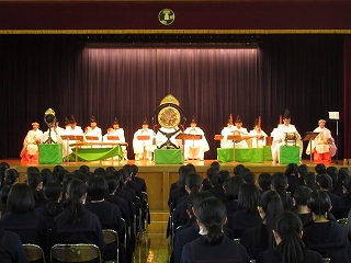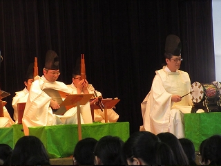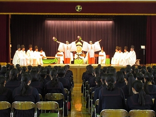 鶴岡八幡宮の方々をお招きしての雅楽鑑賞会が、3月13日に高校二年生を対象に講堂で行われました。本校では、雅楽の他にも日本の古典芸能に触れる機会として高一では能楽を、高三では歌舞伎を鑑賞しています。鶴岡八幡宮の雅楽については、25年ほど前から行われています。これは、八幡宮の例大祭(9月)に本校のコーラス部が歌の奉納を行っていることから交流が続いています。