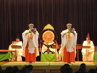 当日は、各楽器の説明から神前結婚式でお馴染みの越天楽、聖徳太子の時代から戦勝を祈願して演奏されたという陪臚(ばいろ)など5曲の演奏がありました。また唱歌のふるさとを雅楽用に編曲されたものを皆で歌うという場面もありました。最後に巫女さんによる萬代の舞が披露され、悠久の調べを堪能しました。