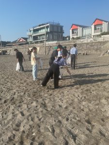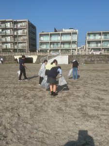 9月27日(土)、インターアクトクラブが逗子海岸のビーチクリーン活動に参加しました。この活動は、同じ地区のインターアクトクラブとして毎月交流している逗子開成中学校高等学校さんのご協力で、数年前から恒例となっているボランティア活動です。学校の目の前が海という立地を活かし、海洋教育センターという施設を有する逗子開成さんに会場を提供していただき、逗子市役所の方からお話を伺った後、実際に海岸で清掃活動を行い、その後班ごとにディスカッションと発表を行いました。