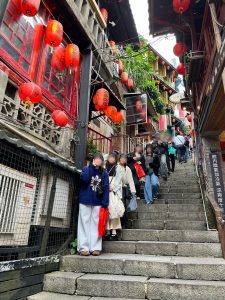 次の九份は、昔、仲の良い9世帯がこの辺に住んでいて、何かお買い物をしてきたときには必ず9人分に分けたことからついたとも言われているそうです。急な階段を上ったときには、どうなることかと思いましたが、展望台から見た美しい海はとても青く輝いていました。千と千尋の神隠しで、有名な建物もこうしてみると味わい深いなと感じました。