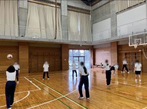 バレーボール部は、明るく優しい雰囲気の中で活動しています。練習中には自然と笑いが生まれる事もあります。お互いに声を掛け合いながら、基礎を大切にして練習しています。