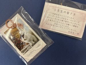 在校生から、先輩たちへ感謝の気持ちを込めて、部活動の舞台発表のほか、学園所有のレーザーカッターで制作したアクリルキーホルダーと「卒業おめでとうございます!」のメッセージを入れた動画を送らせていただきました。学園での思い出のひとつにしていただけると幸いです。あらためまして、先輩たちの前途が幸多きものであるよう、お祈りしております!(NH)